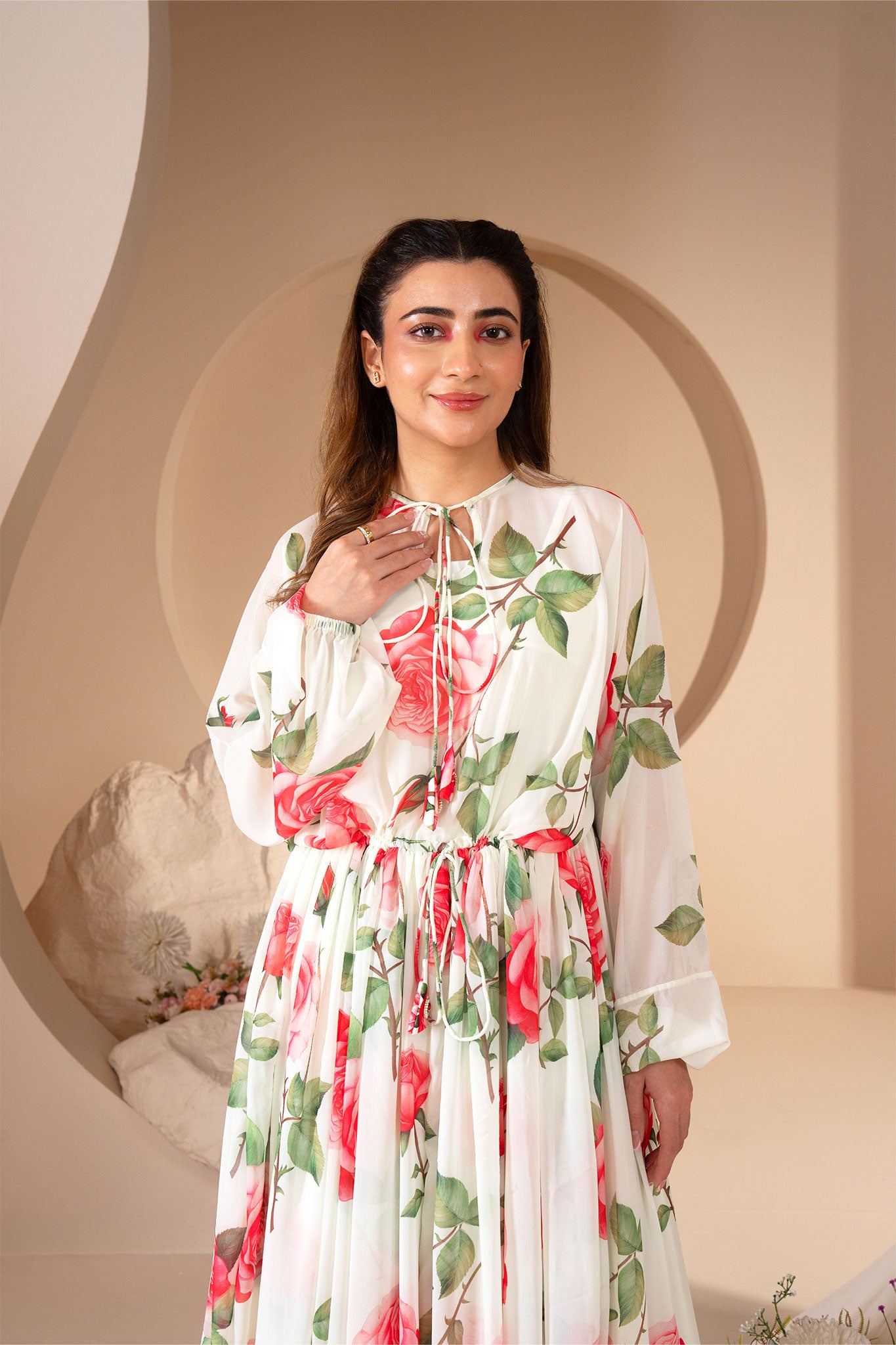 Bloom is a dress for those who dare to witness themselves fully. Flowing and pleated, with ankle-length volume that moves like petals in wind. Round neckline with a delicate keyhole opening, tied with a drawstring. Long, billowy, and slightly translucent sleeves. Cinched with a drawstring, creating a gentle hourglass shape without rigidity. Relaxed yet shaped.