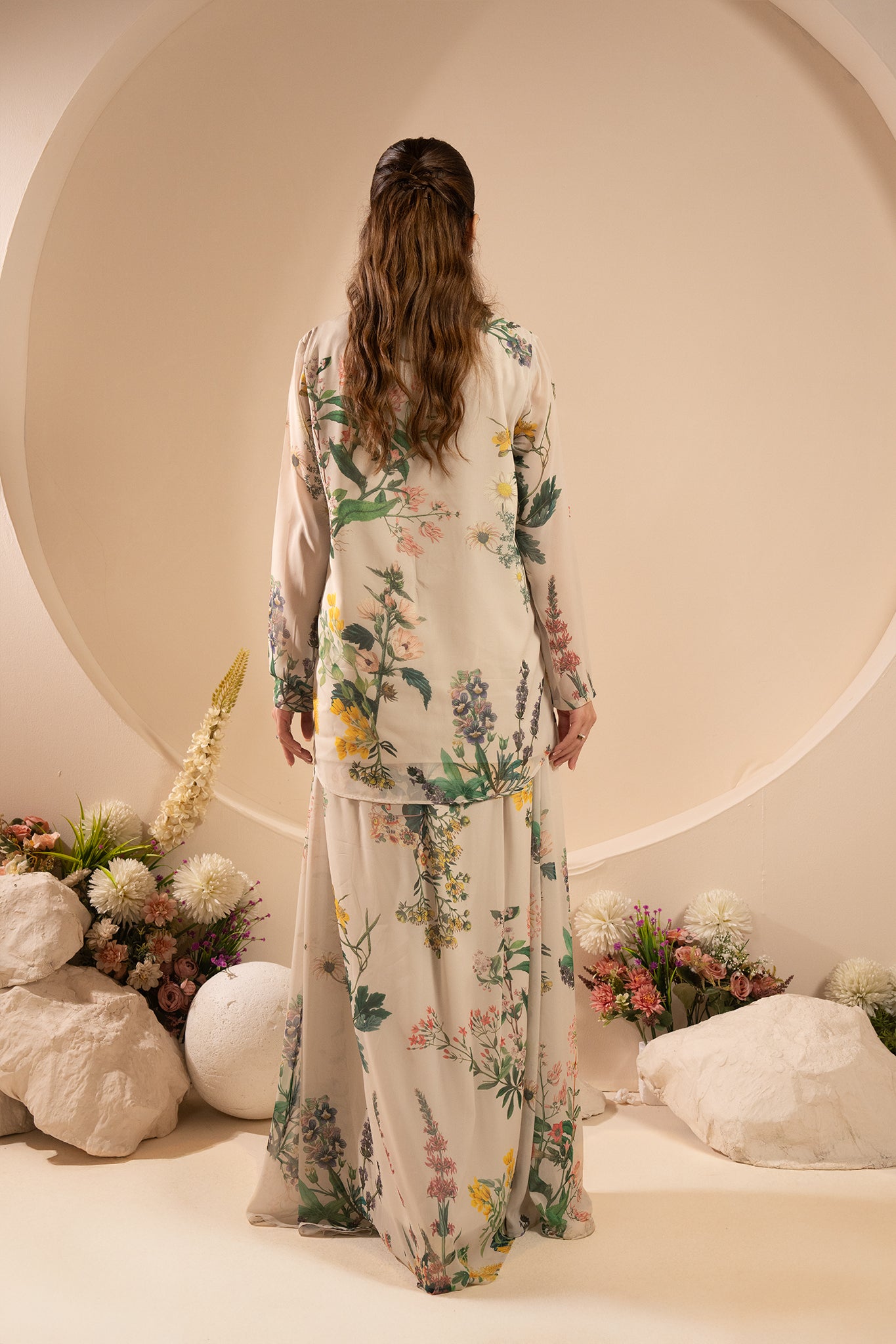 Florashade top with a button-down front in chiffon georgette. Full and relaxed sleeves. Lightly structured through the shoulders and chest, flowing gently at the waist.