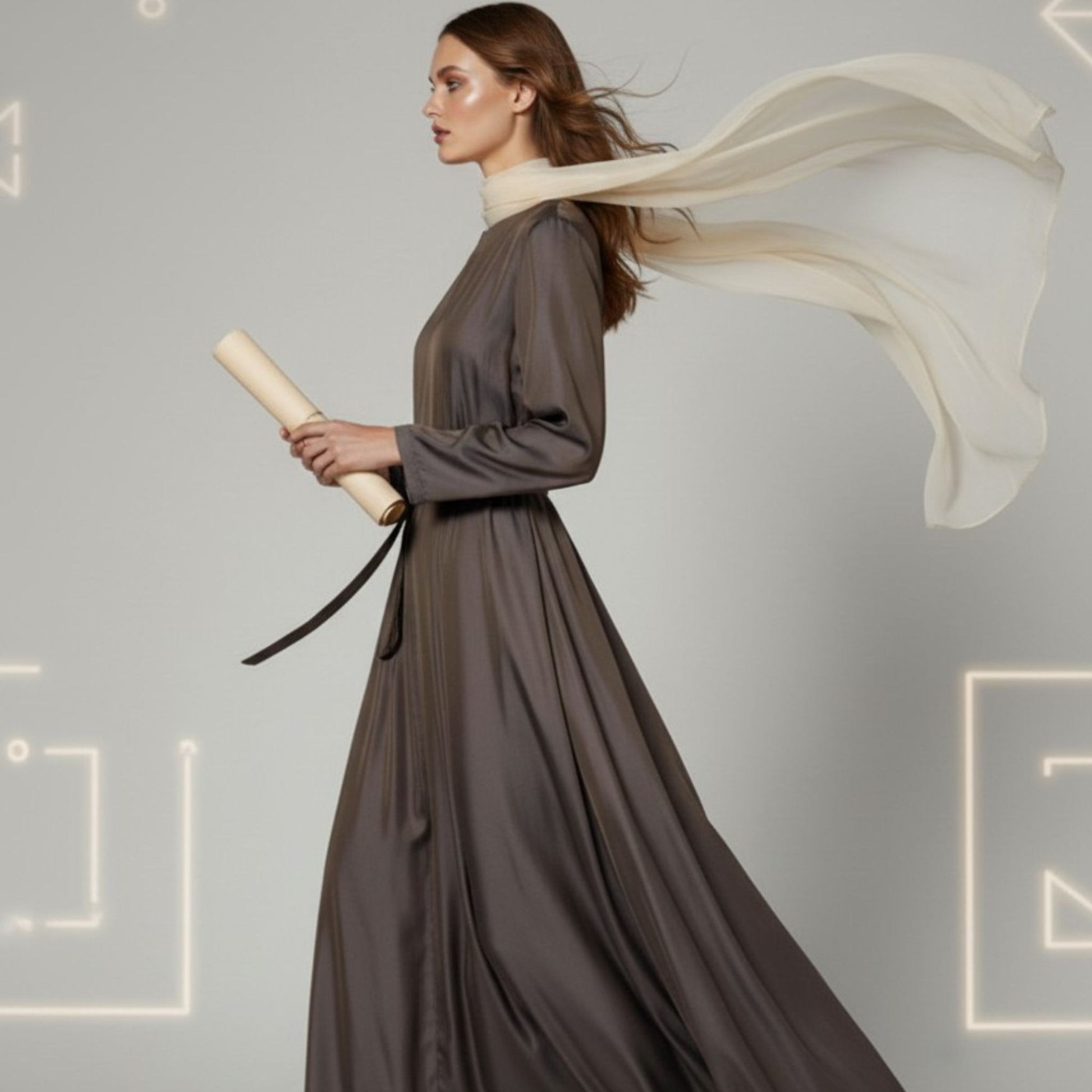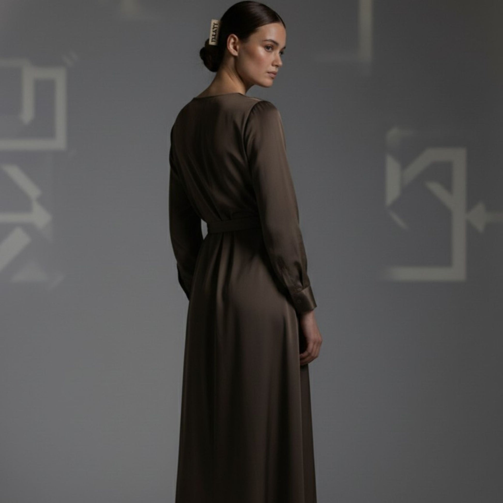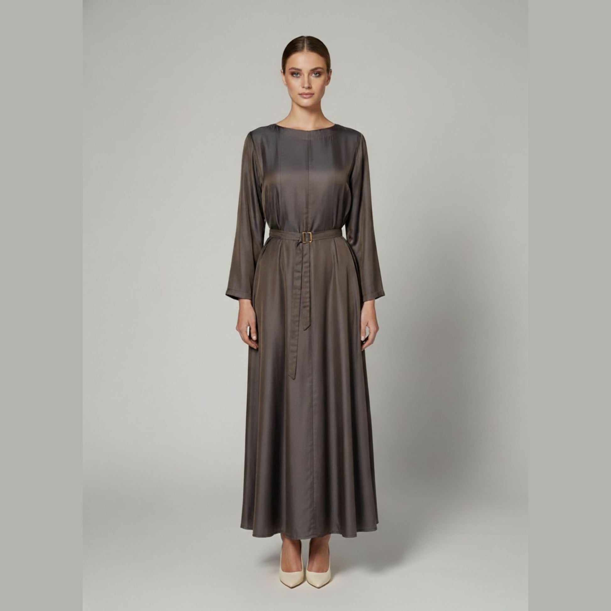 Taupe belted dress features a high, round neckline and a flowy skirt that moves with you. The waist is accented with a belt featuring a delicate metal buckle, adding a refined focal point to the monochromatic luxurious look.